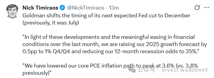 有“新美联储通讯社”之称的知名财经记者Nick Timiraos在X平台上援引了高盛推迟降息预期至今年12月的表态: